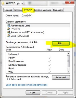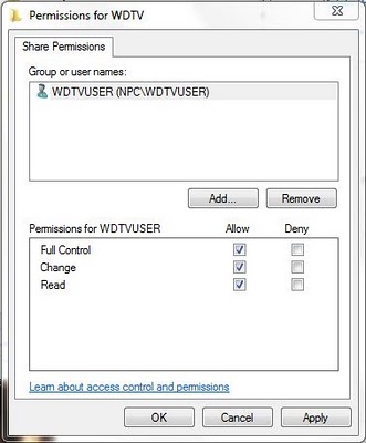 -Share and Security Permissions granted to the new standard user you created to access and modify the WDTV folder.