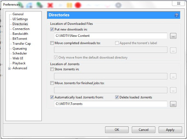 F. In the box underneath of “Automatically load .torrents from” type in: “C:\WDTV\Torrents” (without the quotes) It should look like this: