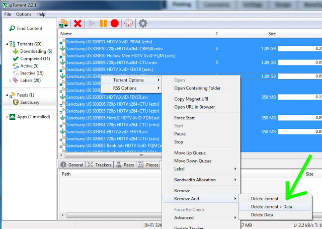 NOTE: uTorrent will automatically start downloading EVERYTHING in the feed starting with the most recent episodes. If you don’t want the last 20 episodes (or however many come up) it would be a good idea to highlight them all, right click, and from the context menu select “Torrent Options -> Remove And -> Delete Torrent + Data” This will tell uTorrent to delete any files or data is has downloaded in the last several second and to NOT download any of the items you have selected. See the image below…