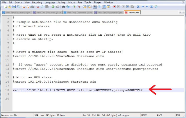 Of course, your text will be ALL in black and that is okay. The imperative thing is that all of the spacing and everything in red remains the same. Just to be clear, there is a space after xmount a space between WDTV and WDTV, a space between WDTV and cifs, a space between cifs and user=. Those are the only spaces. To be more clear :), there is NO space before or after the comma that separates the username from pass=. I hope that was clear (probably not) but the syntax is very important.
